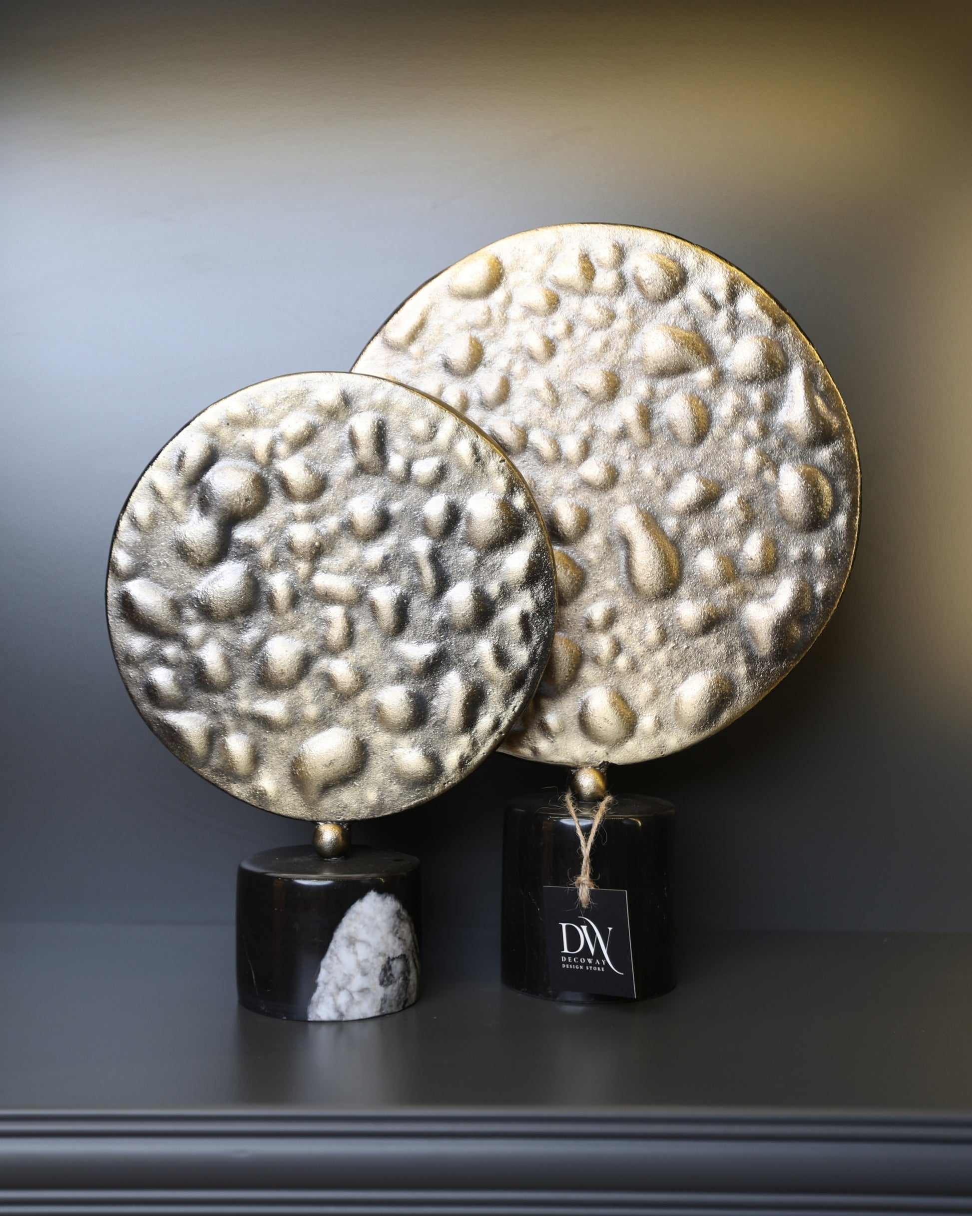 Kabartmalı yüzeyiyle dikkat çeken bu 2’li disk seti, modern sanat çizgisini dekorasyona taşır. Yüzey dokusu ürüne derinlik ve hareket kazandırır. Kitap üstü kullanım, konsol veya ofis dekorasyonunda sofistike bir tamamlayıcıdır.