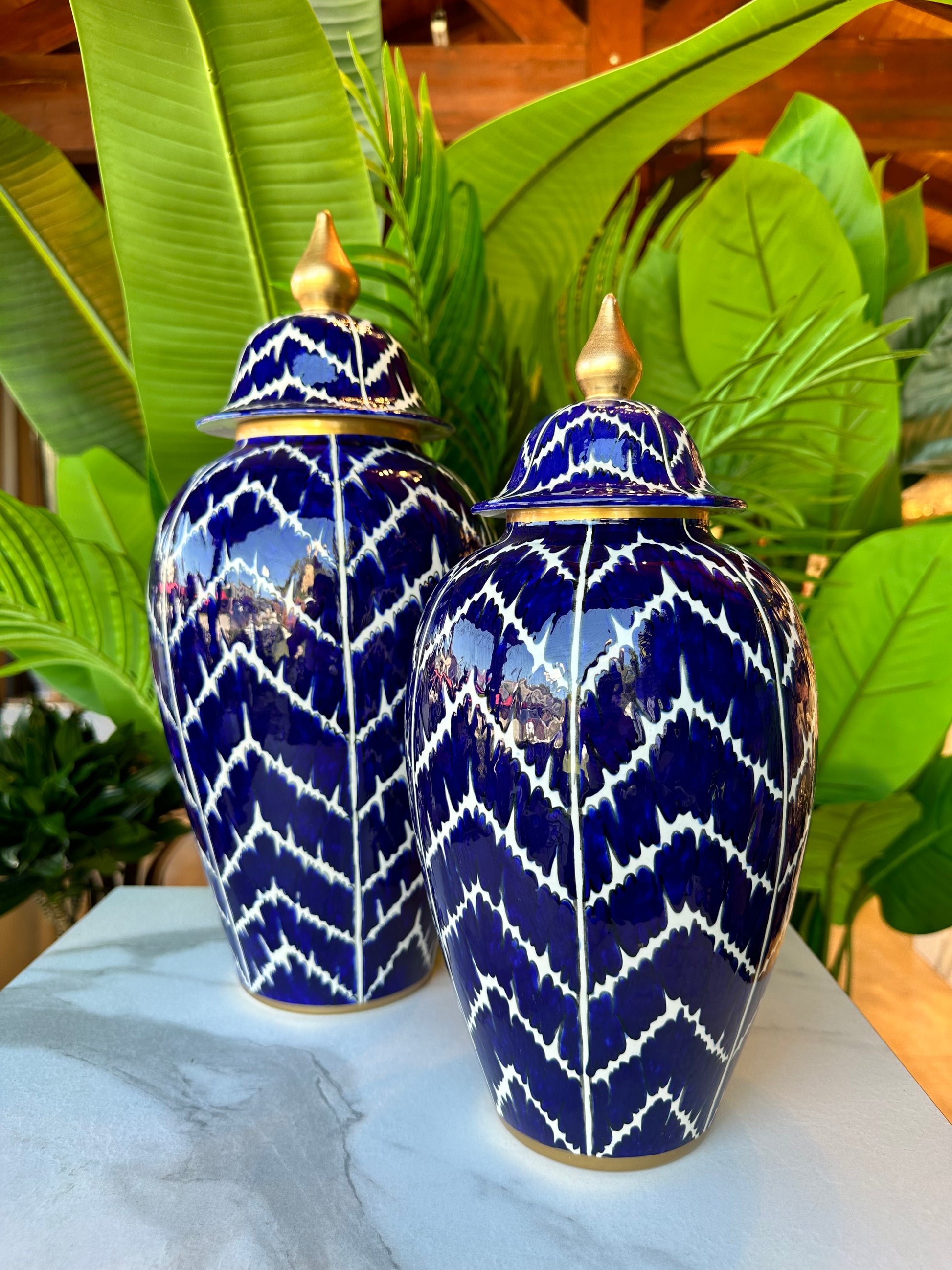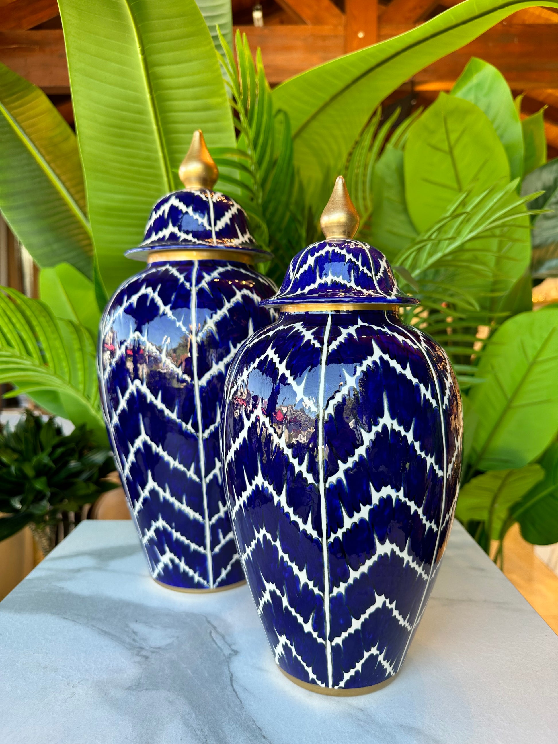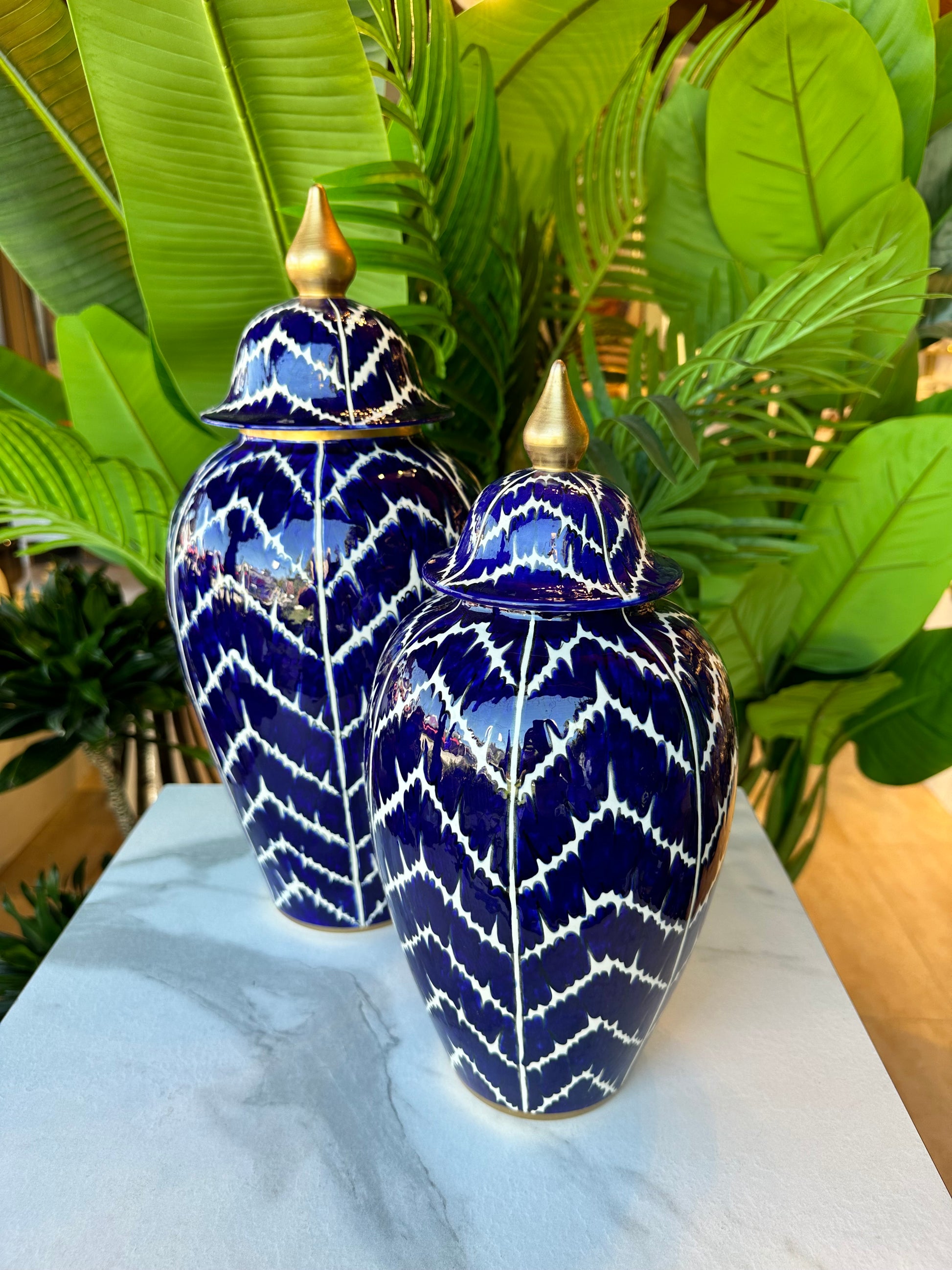Klasik zarafeti modern desenlerle buluşturan 2’li Parlament Desenli Seramik Küp Seti, lacivert zemin üzerine işlenmiş beyaz desenleriyle dikkat çeker. Altın kapak detayları, tasarıma sofistike bir dokunuş ekleyerek mekânınıza lüks bir atmosfer kazandırır.