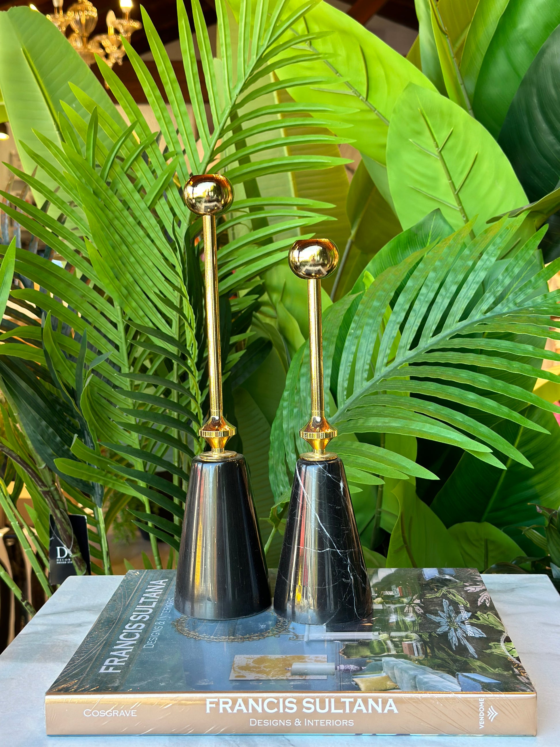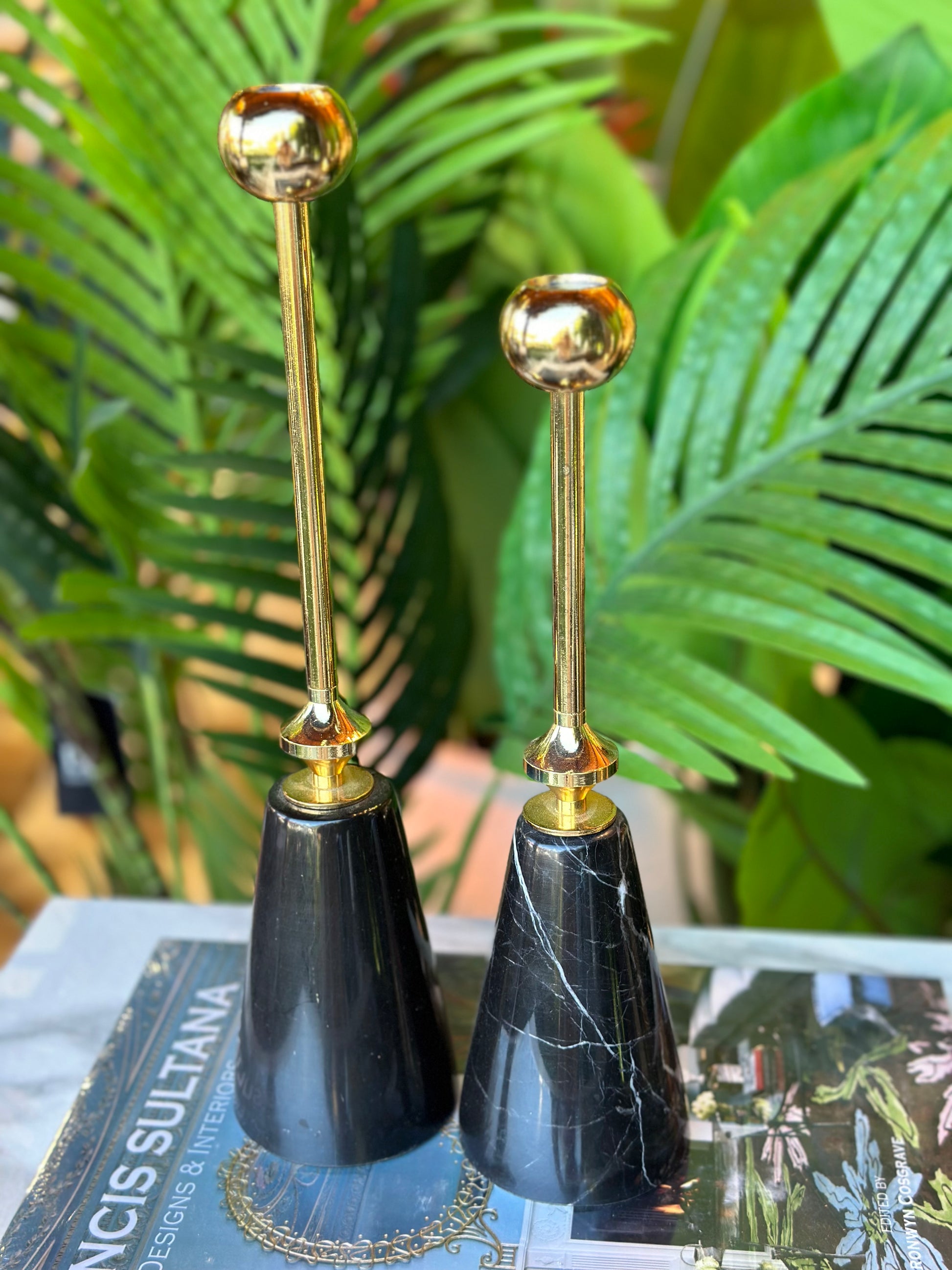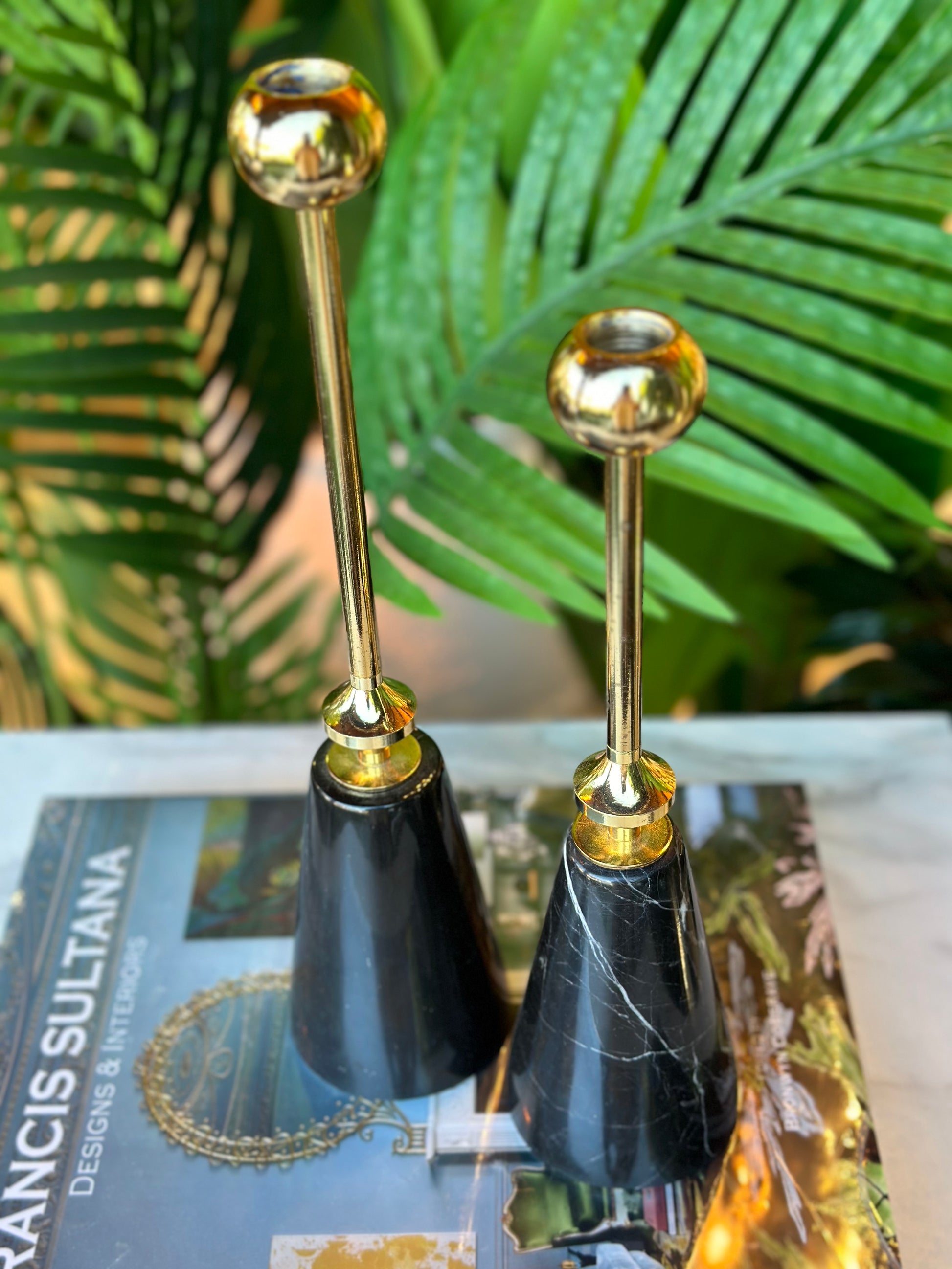 Zarif tasarımıyla öne çıkan 2’li siyah mermer gold şamdan seti, modern ve lüks dekorasyon anlayışını yansıtır. Siyah mermer gövdesi ve altın detaylı şık formuyla hem klasik hem de çağdaş mekanlarda dikkat çekici bir aksesuar olarak öne çıkar.