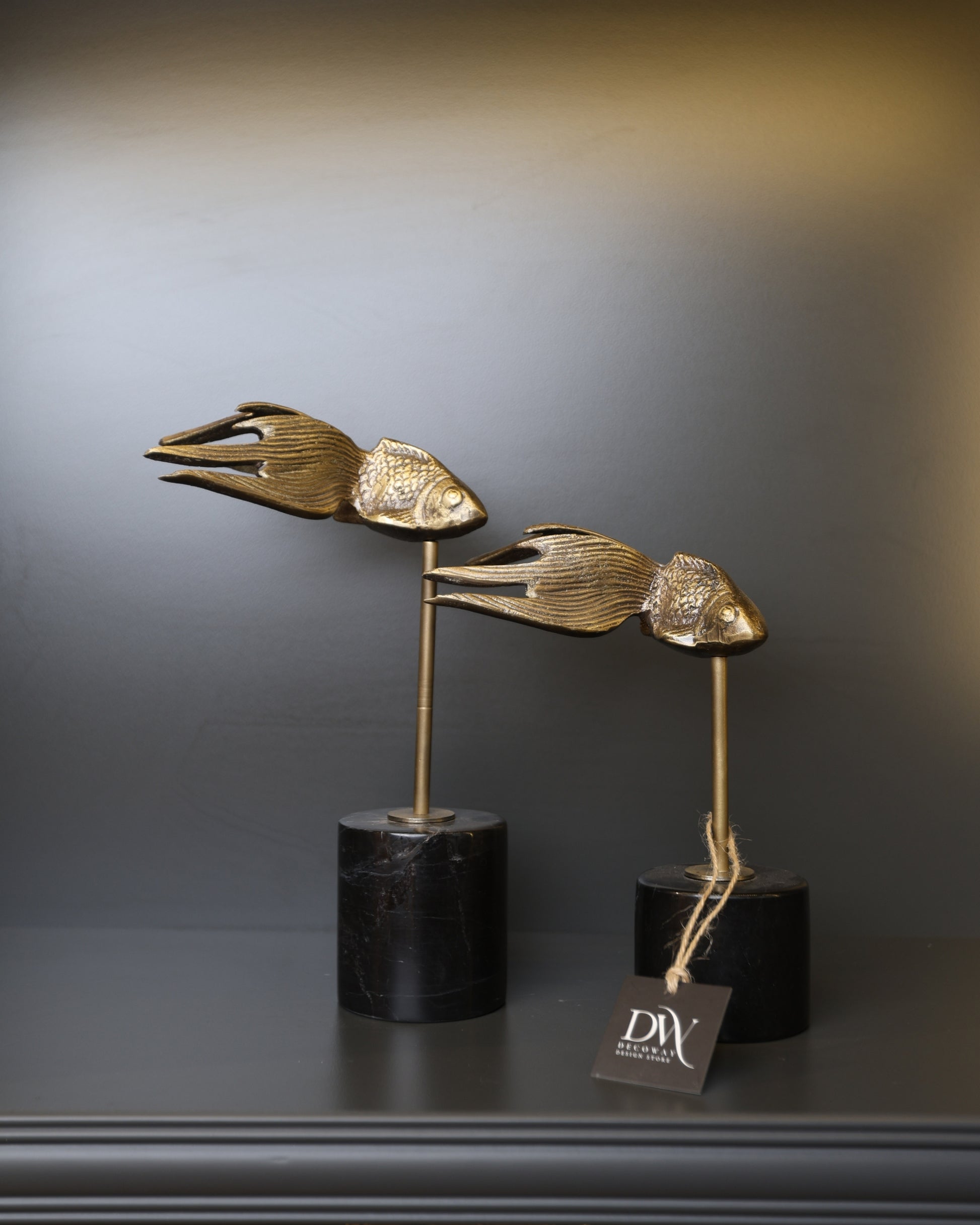 Akışkan balık formu, hareket ve yaşam enerjisini temsil eder. Bronz dokulu yüzey ile siyah mermer kaide birleşimi sofistike bir bütünlük oluşturur.