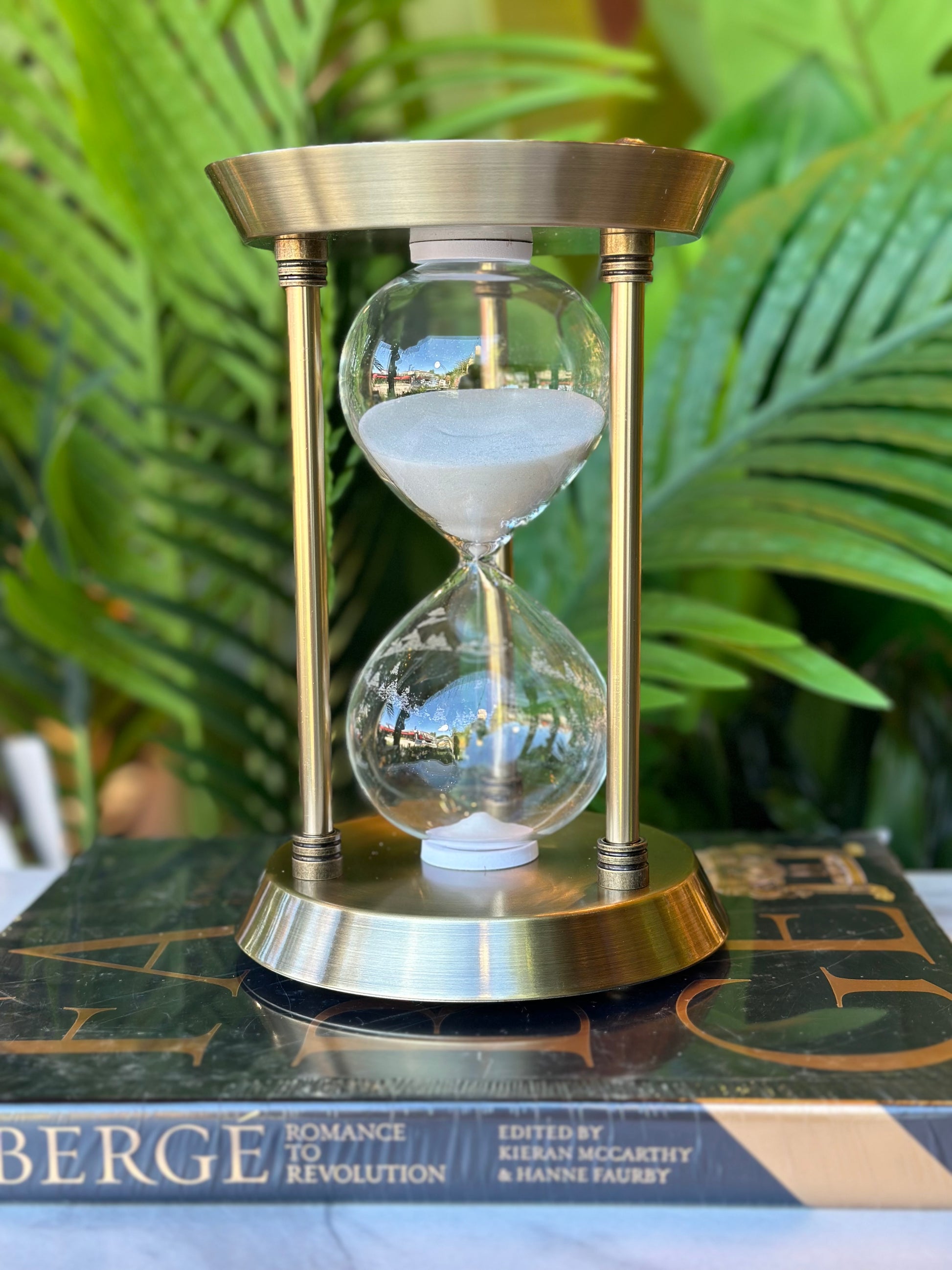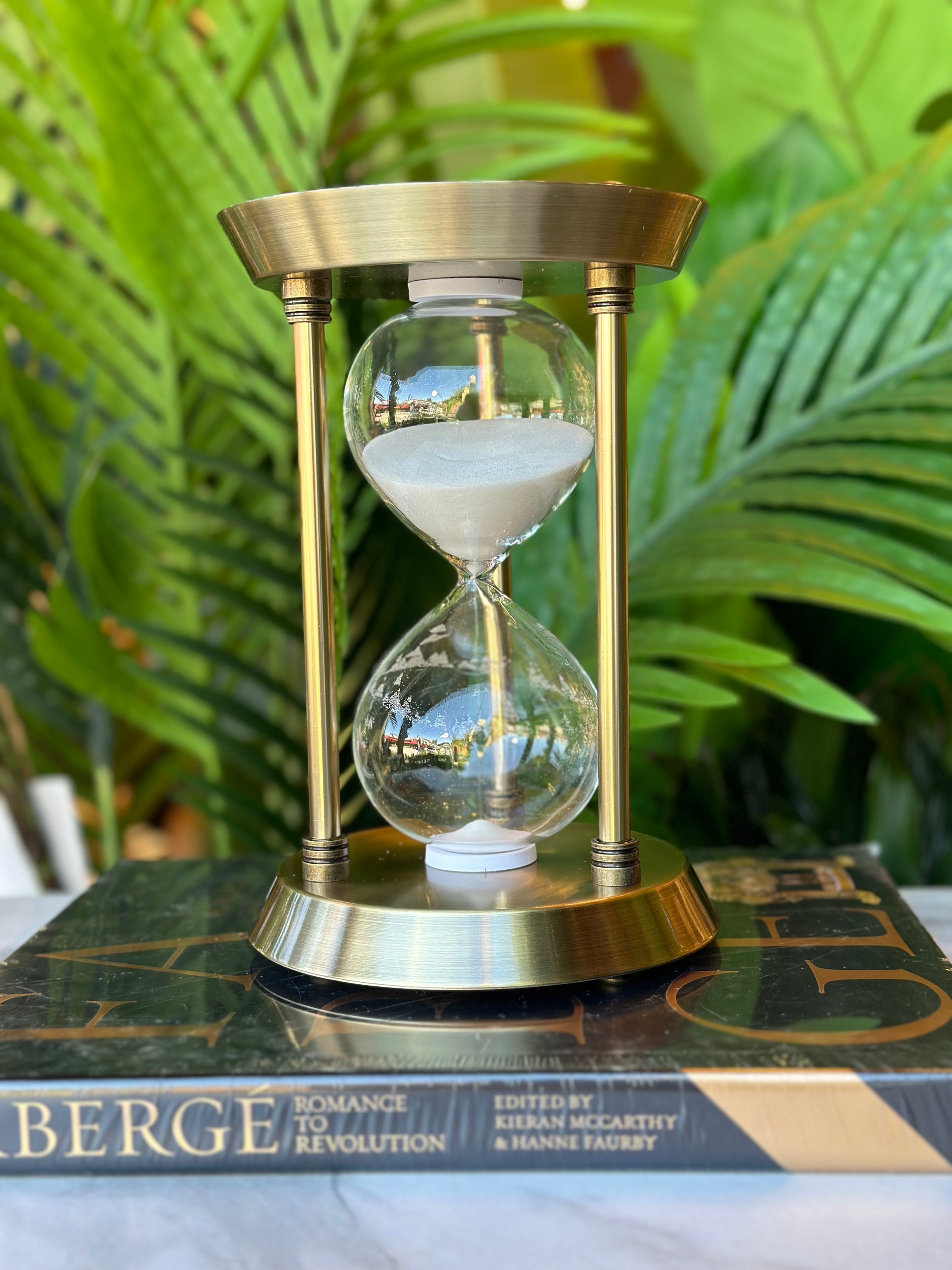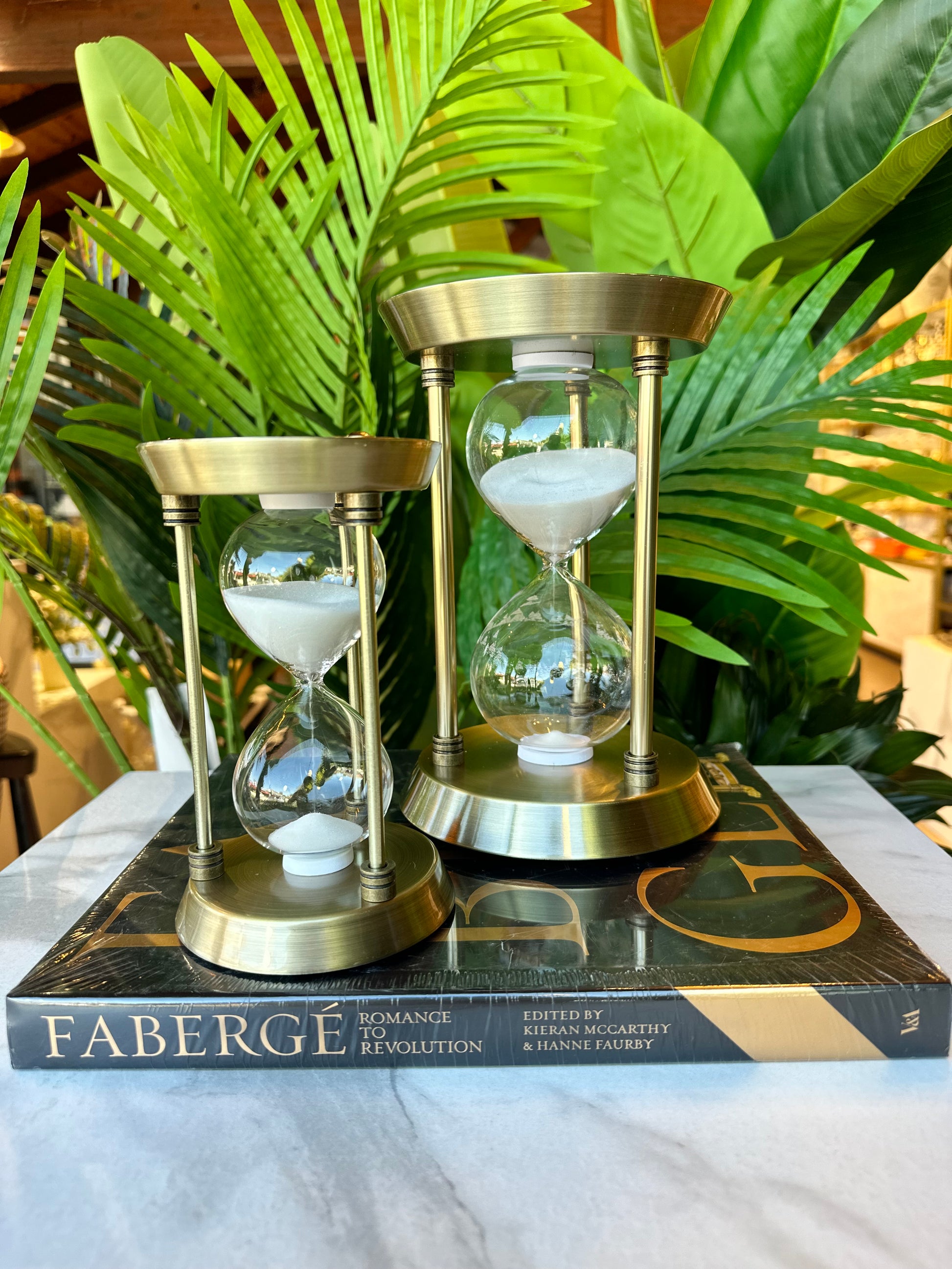 Zamanın akışını estetik bir dokunuşla yaşam alanınıza taşıyan büyük boy kum saati, şık ve dekoratif tasarımıyla öne çıkıyor. Pirinç görünümlü metal çerçevesi ve cam haznesindeki ince beyaz kum, hem klasik hem de modern dekorasyonlarla mükemmel uyum sağlar.