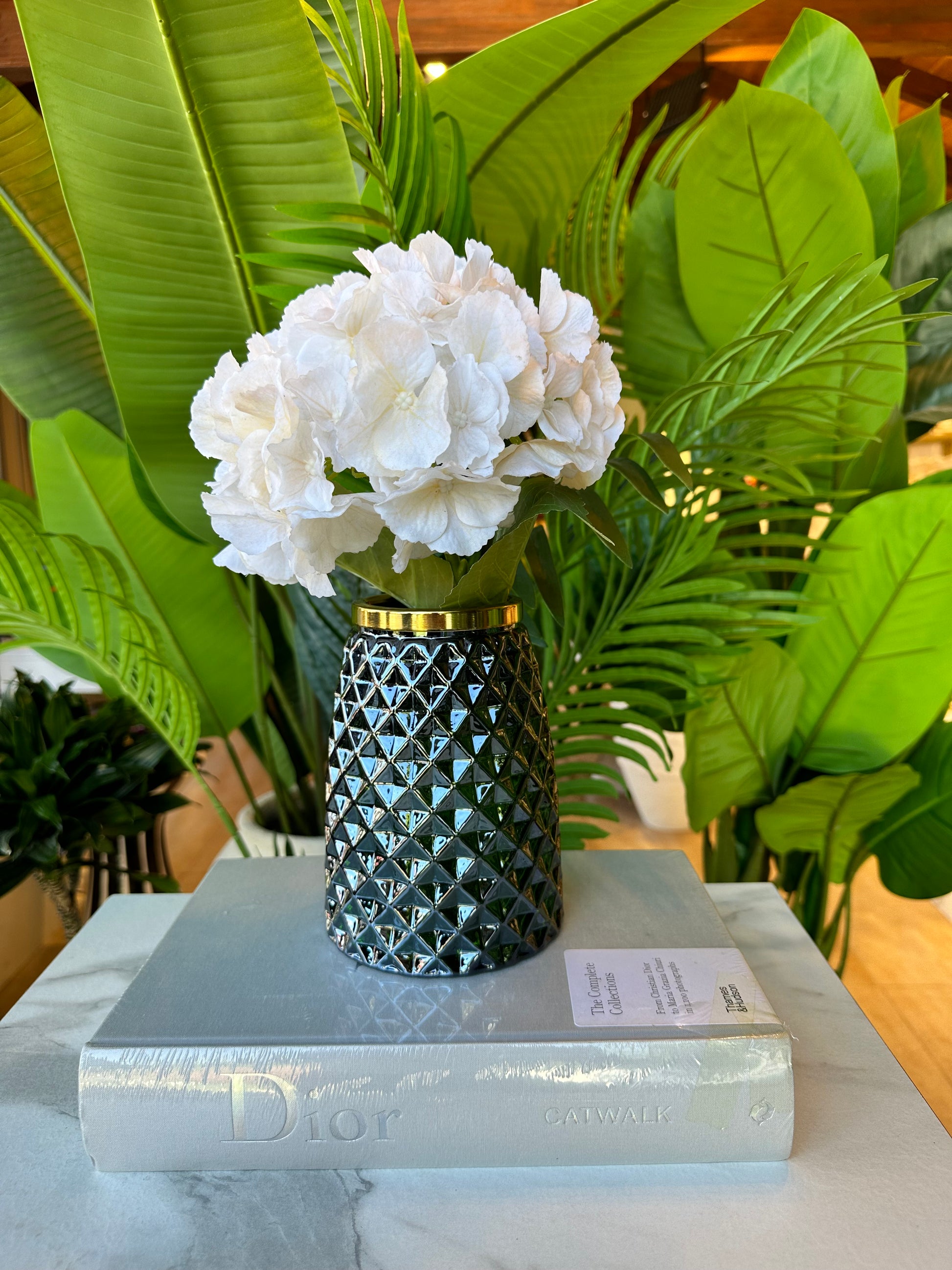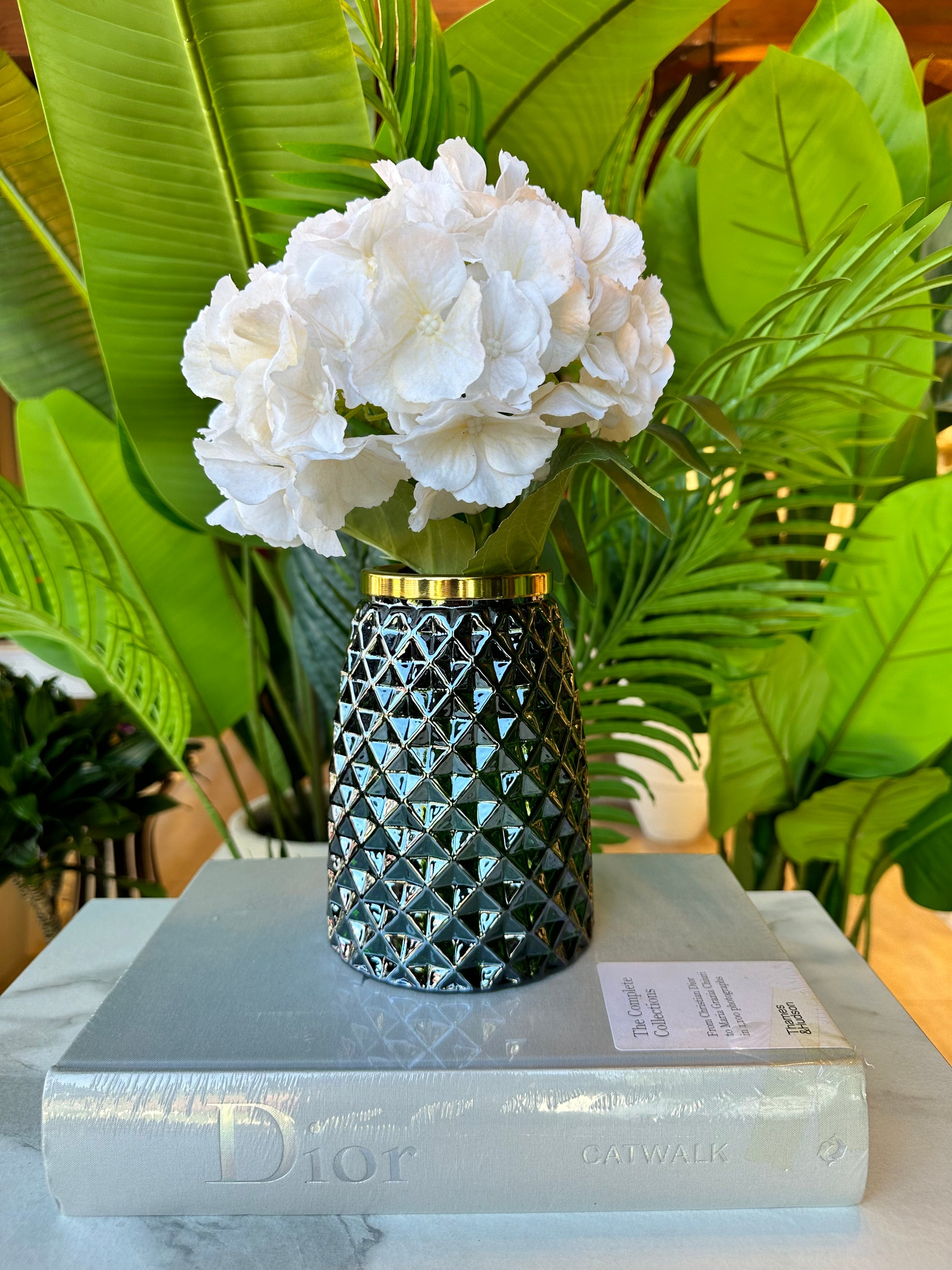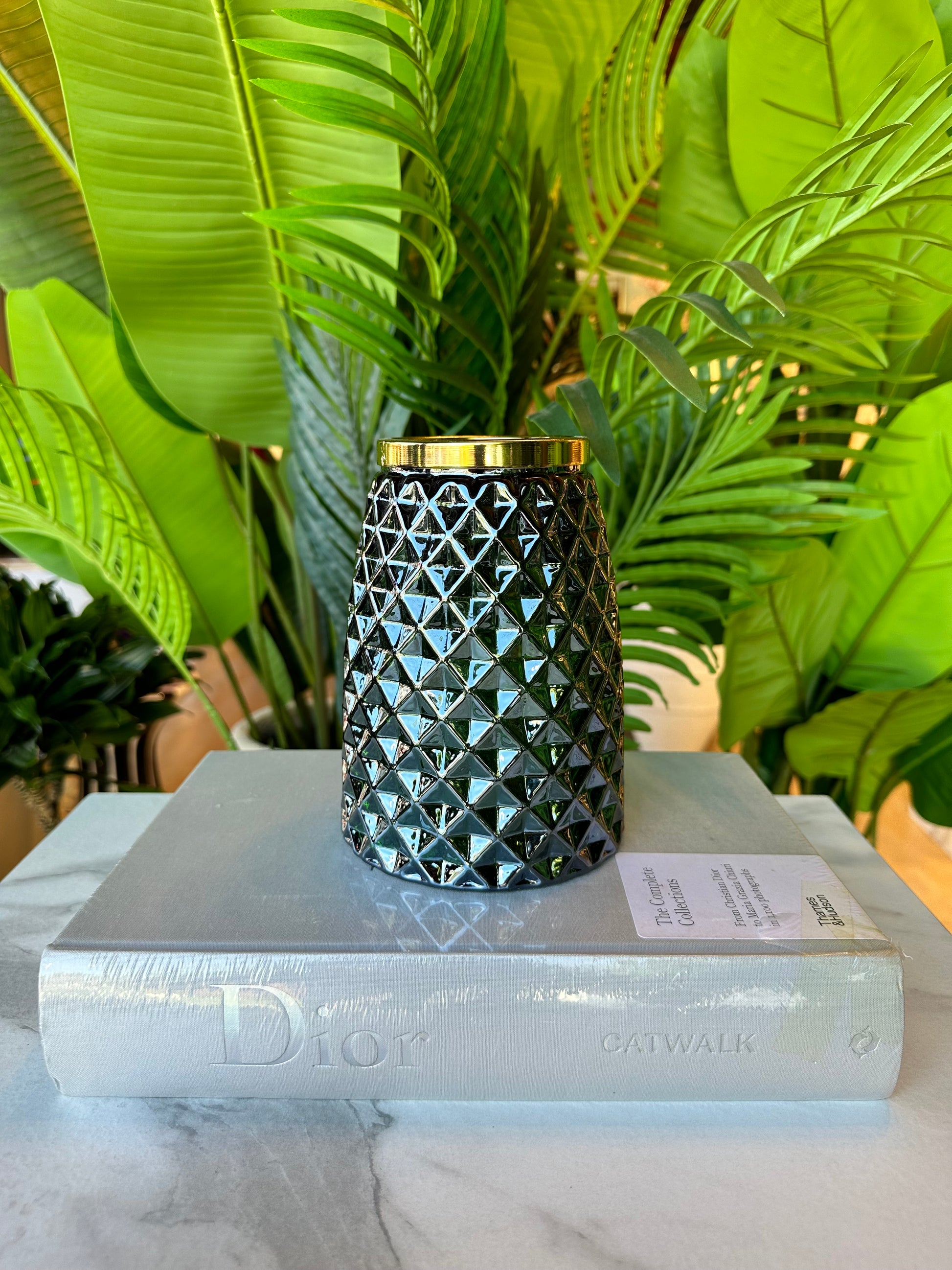 Zarif baklava desenleriyle öne çıkan Cam Baklava Desenli Gold Detaylı Vazo, petrol renginin sofistike tonunu altın detayla buluşturarak lüks bir görünüm sunar. Işığı yansıtan geometrik yüzeyi sayesinde bulunduğu mekânda göz alıcı bir dekoratif vurgu oluşturur.