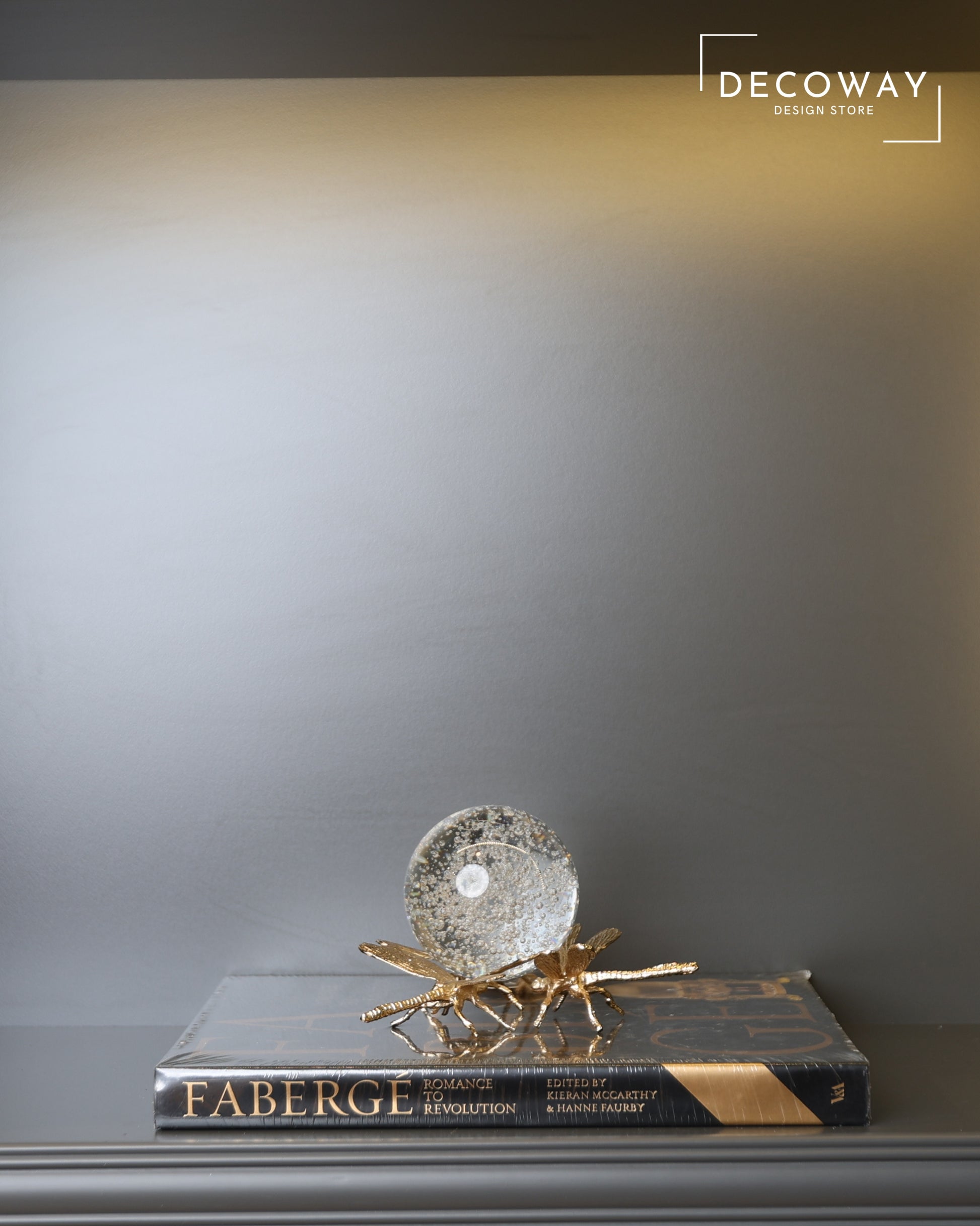 Zarif gold yusufçuk figürü ve içerisinde baloncuk dokuları barındıran kristal küre ile tasarlanan bu özel obje, mekânlara lüks ve sanatsal bir karakter kazandırır. Işığı kıran kristal küre, baloncuk detayları sayesinde derinlikli ve büyüleyici bir görsel etki sunarken; gold yusufçuk figürü tasarıma zarif bir hareket katar.